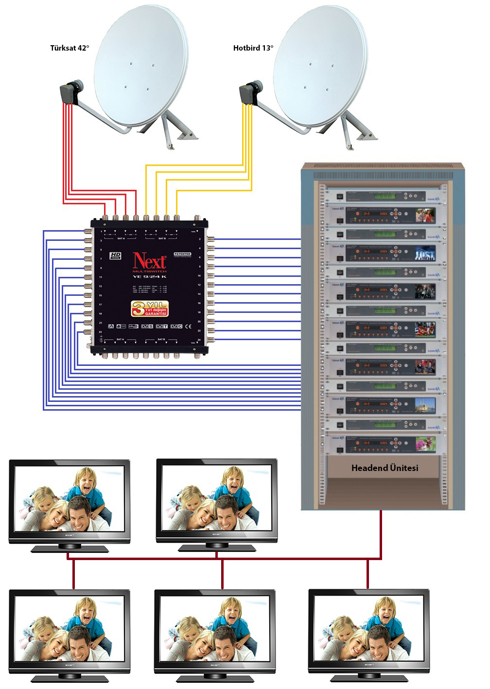 Head End (SMATV- Satellite Master Antenna TV) site, tatil köyü, otel, hastane vb. yerleşim yerlerinde bir merkezden tek kablo üzerinden belirli sayıda TV kanalının iletilmesi için kullanılan sistemdir. Kullanıcıların isteklerine göre seçilen kanallar merkezden daire veya odalara iletilir. Daire/odalarda harici bir alıcıya(receiver) ihtiyaç yoktur, merkezden gelen kablo televizyonların anten girişine bağlanarak yayınlar izlenmektedir.> Aşağıdaki şemada gördüğünüz headend sisteminde Türksat ve Hotbird uydularından seçilen 24 tv kanalı kullanıcılara iletilmektedir.